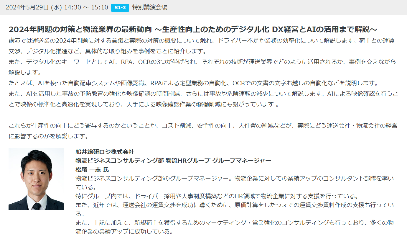 運輸・物流業界の悩みを解消するIT・デジタルソリューションが一堂に会する展示会「運輸安全・物流DX EXPO」の特別講演会場にて、弊社コンサルタントの松尾一志が「2024年問題の対策と物流業界の最新動向 ~生産性向上のためのデジタル化 DX経営とAIの活用」をテーマに講演しました。