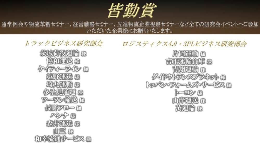 | 皆勤賞 | 通常例会や物流革新セミナー、経営戦略セミナー、先進物流企業視察セミナーなど全ての研究会イベントへご参加いただいた企業様にお贈りいたします。 |