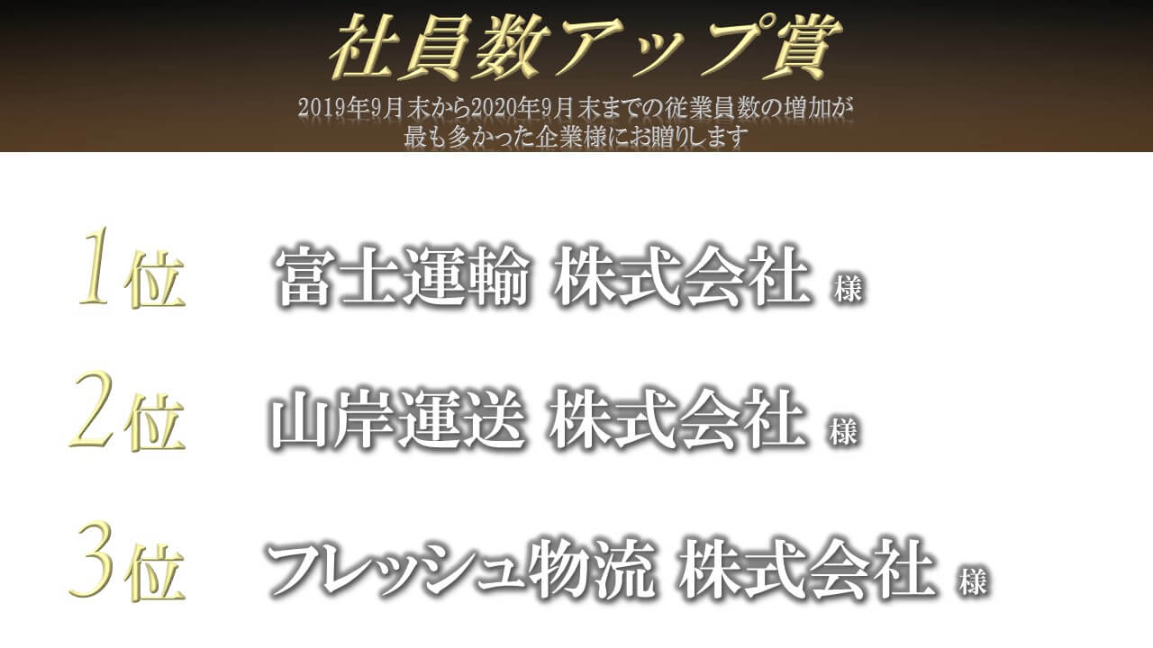 | 社員数アップ賞 | 2019年9月末から2020年9月末までの従業員数の増加が最も多かった企業様にお贈りします。 |