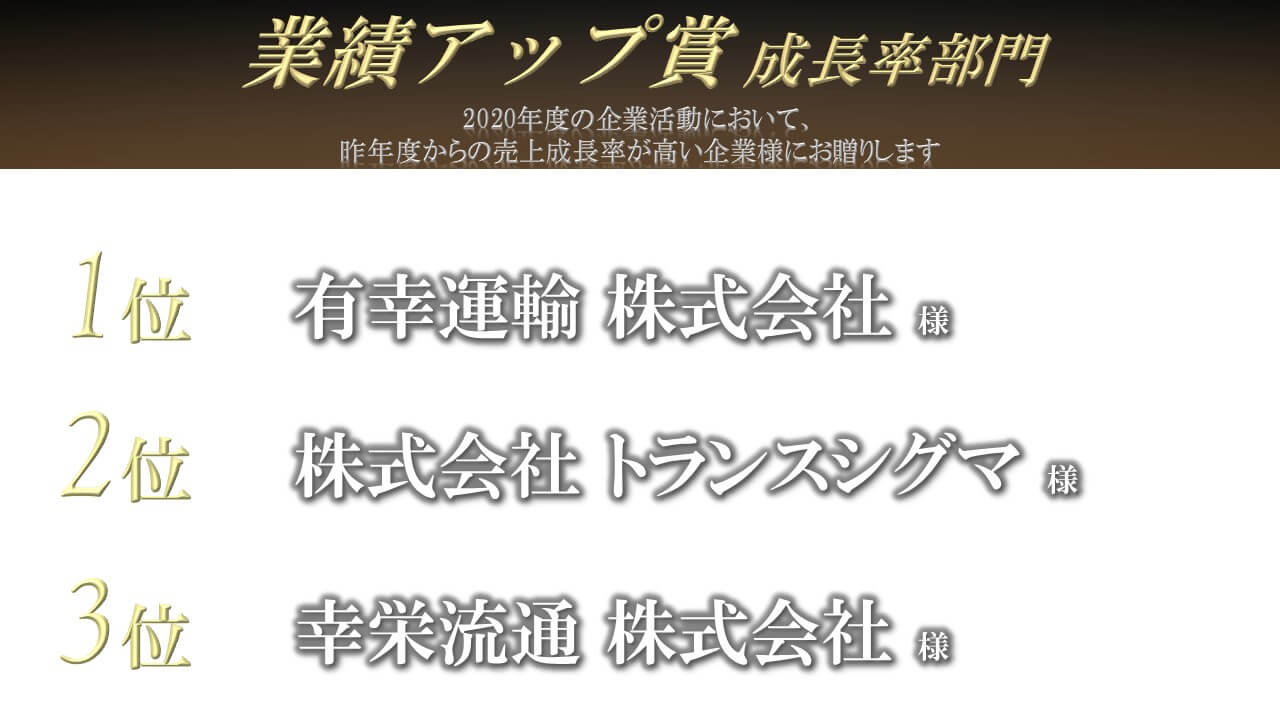 | 業績アップ賞 <成長率部門> | 2020年度の企業活動において、昨年度からの売上成長率が高い企業様にお贈りします。 |