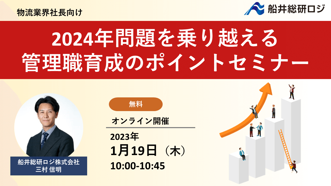 2023年1月19日(木)10:00~10:45、物流会社の経営者経営者を対象に「2024年問題を乗り越える管理職育成のポイントセミナー」をオンラインで開催いたします。 今、多くの物流企業が2024年問題への対応に追われています。 今回のセミナーでは、物流会社における管理者の育成方法についてお伝えします。