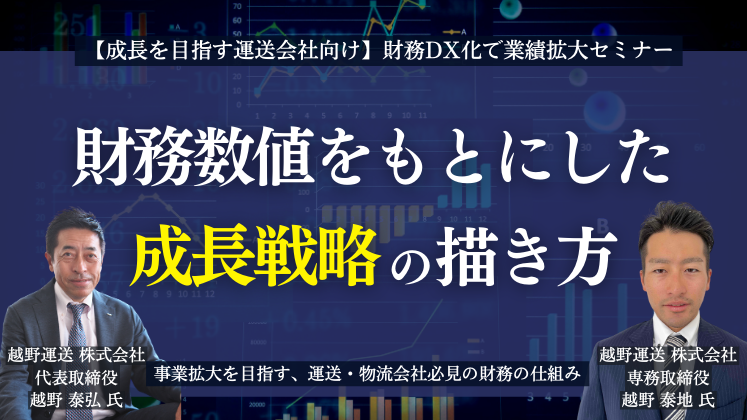 2023年7月11日(火)・13(木)・18(火)・21日(金)、「【成長を目指す運送会社向け】財務DX化で業績拡大セミナー(株式会社船井総合研究所主催)」がオンラインで開催されます。特別ゲストに船井総研ロジが主催するロジスティクス・プロバイダー経営研究会 会員企業の越野運送株式会社 代表取締役 越野 泰弘様、専務取締役 越野 泰地 様が「財務数値をもとにした成長戦略の描き方」をテーマに講演いたします。 ぜひ、お気軽にご参加ください。