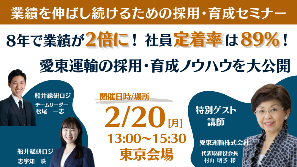 2023年2月20日(月)13:00~15:30、物流企業の経営者を対象に「業績を伸ばし続けるための採用・育成セミナー」を東京会場で開催いたします。 応募も来ないし、いざ入社してもすぐに辞めてしまう。ドライバーが全然増えない、、 そのようなお悩みをお持ちの経営者様はぜひご参加ください。 以下のようなお悩みを持つ方におすすめのセミナーです。
