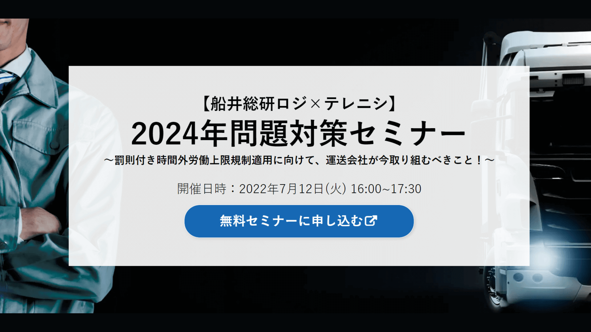 2022年7月12日(火) 16:00~17:30、テレニシ株式会社が主催する運送・物流企業向けセミナー「2024年問題対策セミナー ~罰則付き時間外労働上限規制適用に向けて、運送会社が今取り組むべきこと!~」にて、当社のコンサルタントが講演します。2024年問題への具体的な対策について、くわしく解説します。