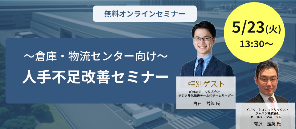2023年5月23日(火)にオンラインで開催される「~倉庫・物流センター向け~人手不足改善セミナー(イノベーションマトリックス・ジャパン株式会社様主催)」で、当社のコンサルタント白石哲郎が「倉庫・物流センター作業員の採用成功事例」をテーマに講演いたします。 ぜひ、お気軽にご参加ください。