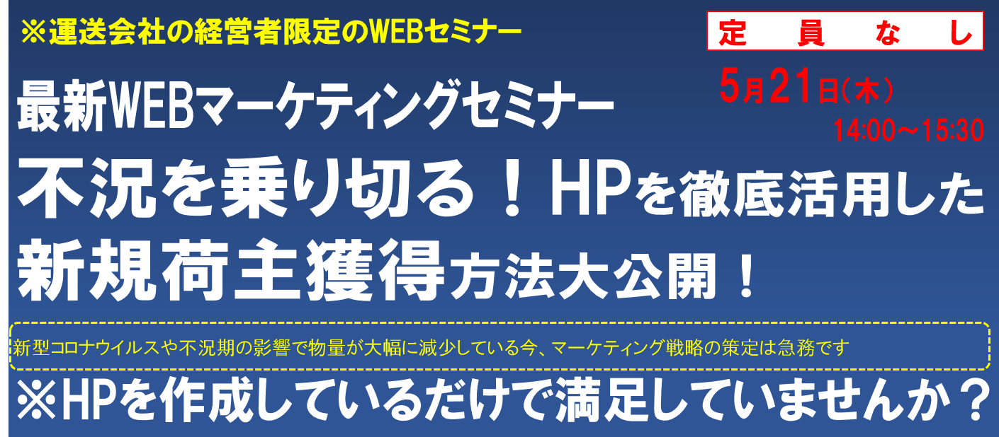 HPを活用した新規荷主獲得においては、アクセス数(HP閲覧数)・問い合わせ率の2軸での戦略を設計する必要があります。本セミナーでは、荷主企業や協力運送会社獲得のためのWebマーケティングの方法を大公開いたします。