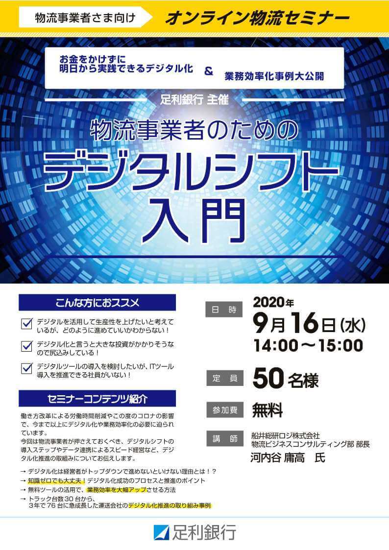 2020年9月16日(水)に足利銀行様主催の物流事業者さま向けセミナーにて、当社コンサルタントがゲスト講師として登壇します。