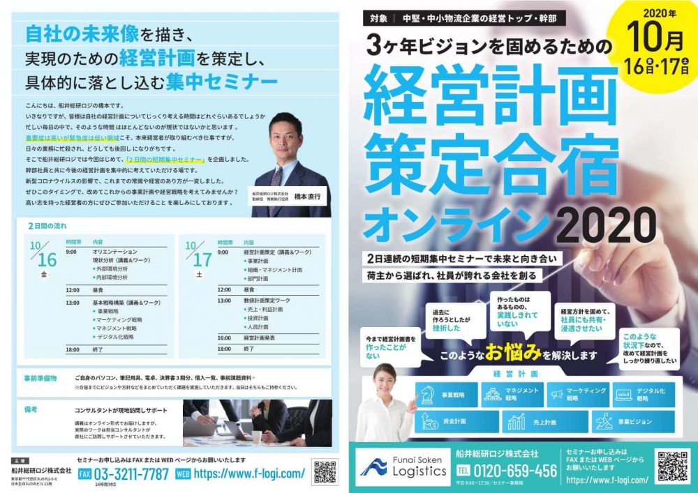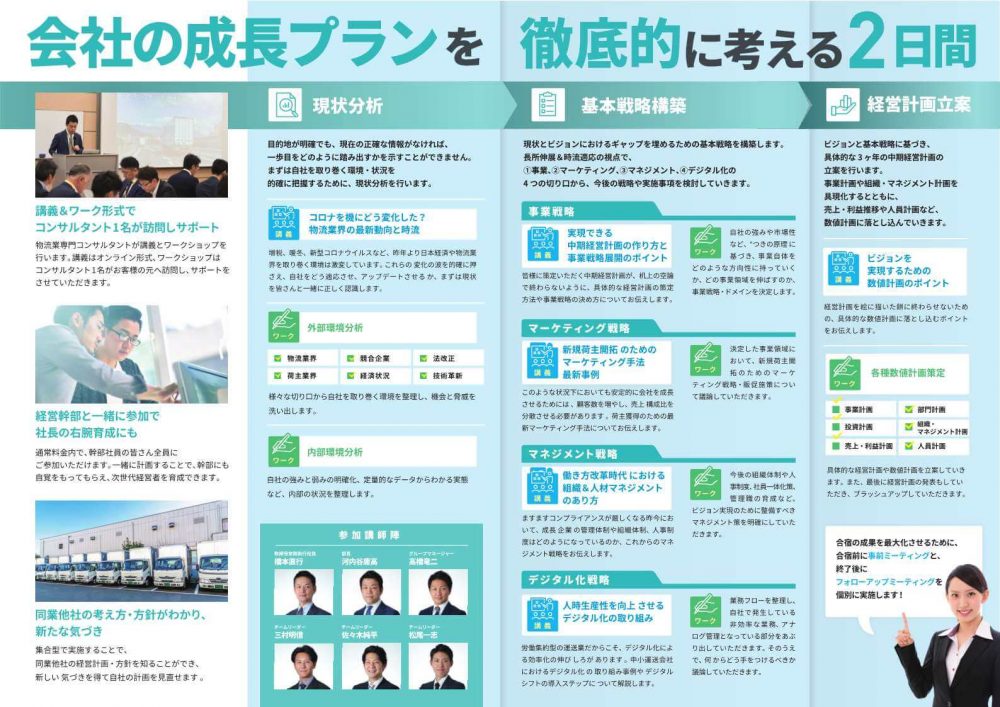 そこで船井総研ロジでは今回はじめて、「2日間の短期集中セミナー」を企画しました。幹部社員と共に今後の経営計画を集中的に考えていただける場です。