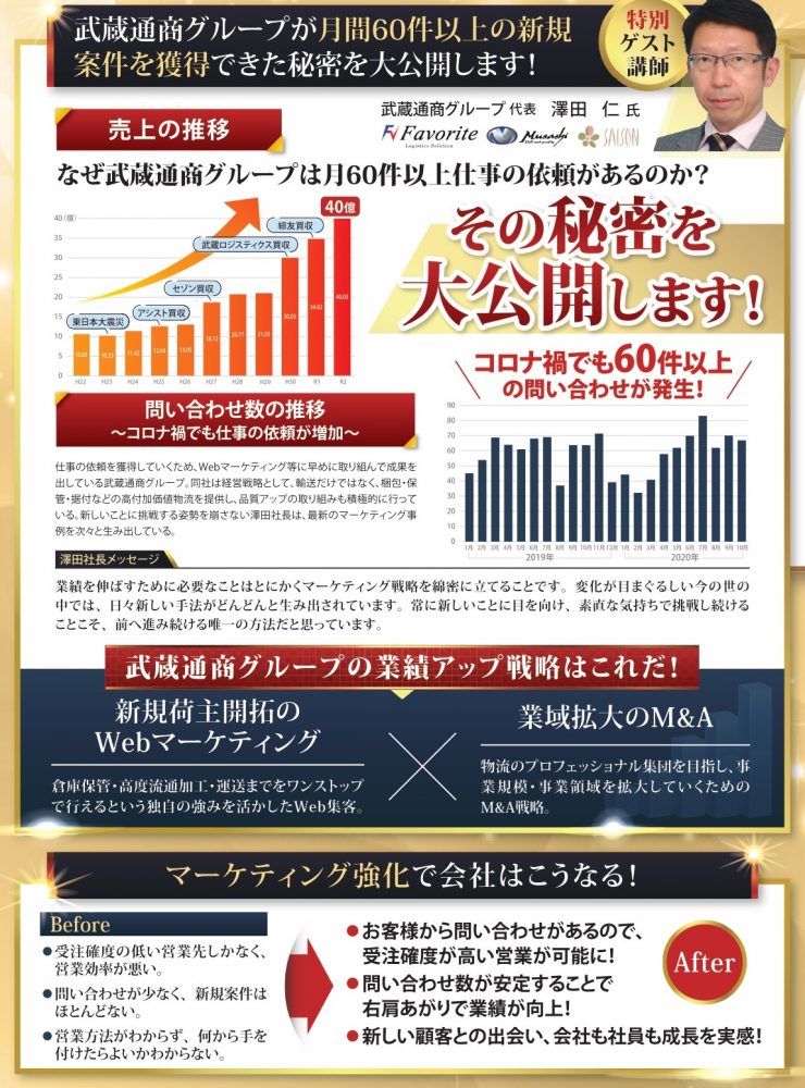 精密機械・重量機械、美術品、高級家具等の全国輸送、搬出入・据付及び撤去、梱包出荷業務、倉庫保管業務を主な事業としている武蔵通商株式会社をはじめとして、6社のグループ企業を経営している超やり手敏腕社長。Webを活用したマーケティングに力を入れており、グループ全体で毎月60件以上の仕事の依頼を獲得することに成功している。会社の業績を上げ続けるとともに、物流業界の地位向上を目指し、日々新たなことにチャレンジをし続けている。