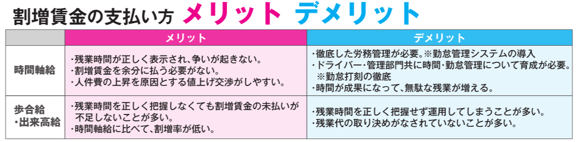 歩合給は時間軸給に比べて、割増賃金が少額で済み、長時間労働になりがちな運送業へのメリットが大きいです。