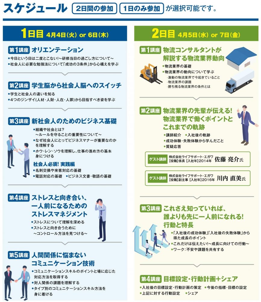 毎年10人以上の大卒採用に成功されているライフサポート・エガワ様(本社:東京都、年商:111億円、社員数:681名)。今回の研修ではその中でもトップで活躍されている新卒採用出身の社員の方に実際の「物流業界」について、また「社会人としてのスタンス」をお話しいただきます。