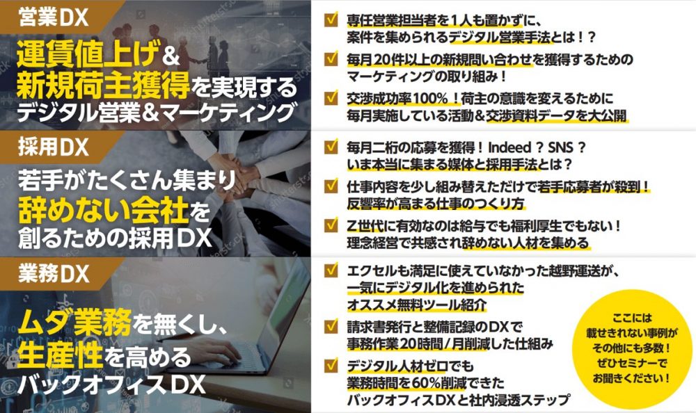 DXにより、採用・運賃交渉・新規荷主獲得・業務効率化のいずれにおいても大きな成果を出し、業績向上を果たした経営戦略についてお話しいただきます。