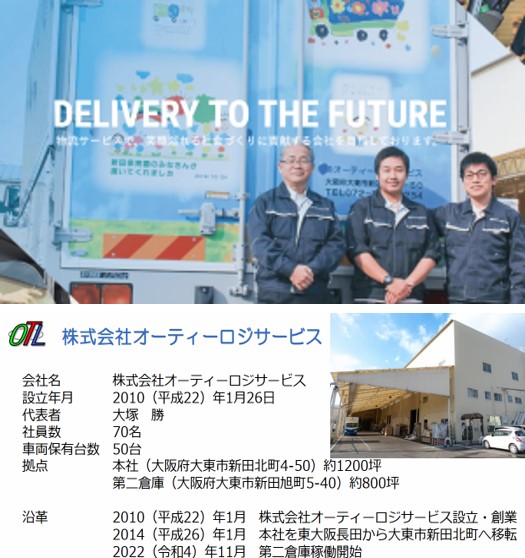 株式会社オーティーロジサービス様は、大阪府大東市に拠点をおく、2010年1月創業の運送会社です。保有車両台数は56台で、住宅用建材、内装全般などから化学品、食品など数多くの商品配送を取り扱っています。