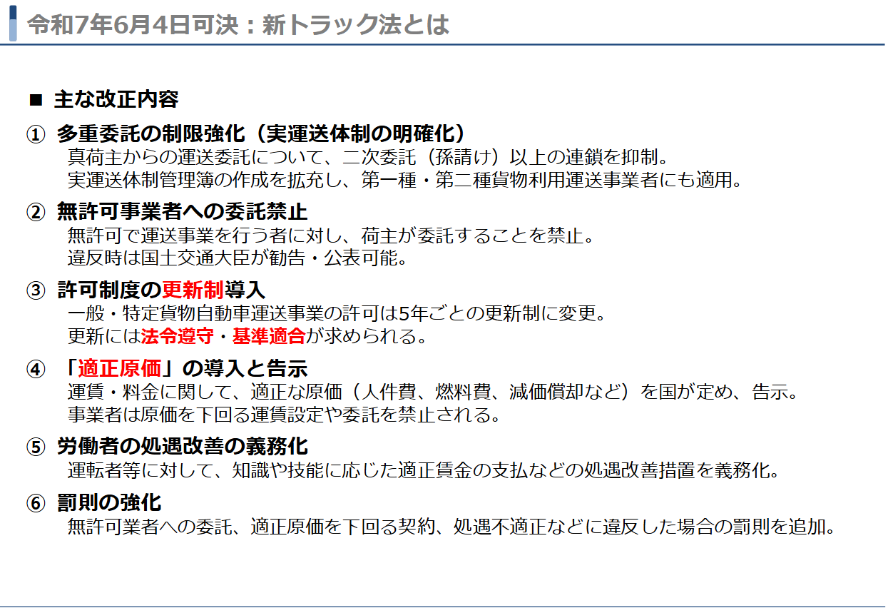 2025年6月に可決された「新トラック法」では、主に「多重委託の制限強化」「無許可事業者への委託禁止」「許可制度の更新制導入」「適正原価の導入と告示」「労働者の処遇改善の義務化」「罰則の強化」の6つの改正(下記参照)が行われました。本セクションでは、特に実務への影響が大きい項目を深掘りして解説します 。