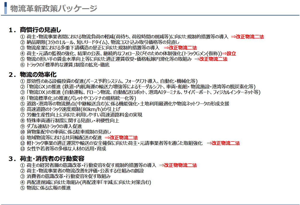 物流を取り巻く課題解決のために、政府が提示したのが「物流革新政策パッケージ」です。この政策パッケージは、これまでの商慣習の全面的な見直し、物流の効率化の推進、そして荷主や消費者の行動変容をも含めて、現在の物流を維持していくためには不可欠であるという考えに基づいています。このパッケージの中には、改正物流2法として、新たな法令に則った取り組みが明確に示されており、今後の事業運営において先読みをする上で非常に重要です。