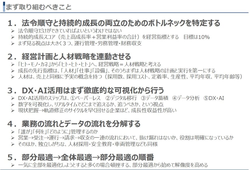 具体的には、業務の流れとデータの流れを詳細に分解し、「誰が」「何を」「どのように」管理するのかを明確にする必要があります。例えば、運行管理や労務管理に関するデータをデジタル化し、分析することで、リスクの早期発見や業務改善に繋げられます。部分最適から全体最適へと繋げることで、効率的な法令遵守体制を構築し、将来的な監査にも自信を持って対応できるよう準備を進めてください。