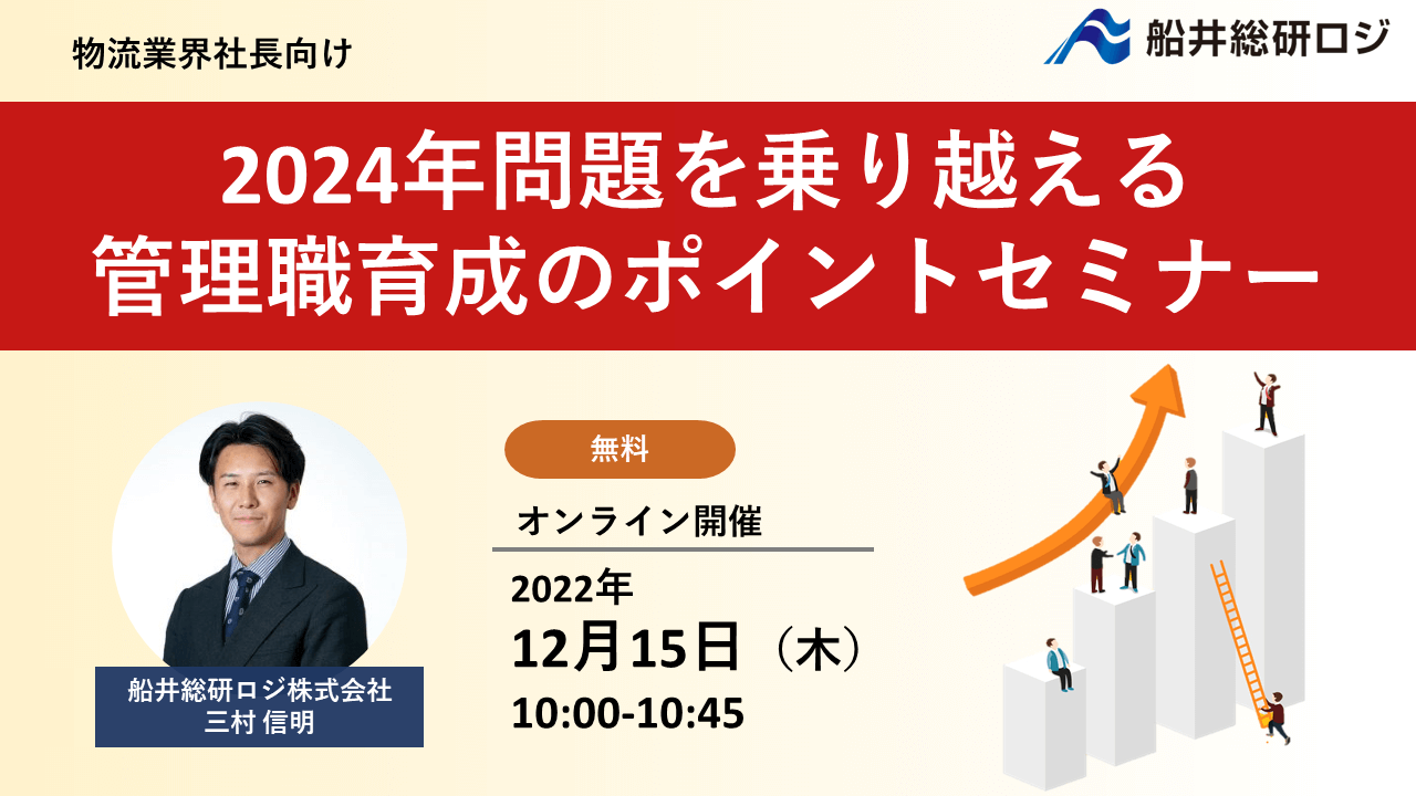 今、多くの物流企業が2024年問題への対応に追われています。 社長1人の力で解決することは難しく、管理者の育成・社内体制の強化は避けては通れません。 労働集約型産業である運送業界において、働き⽅改⾰関連法案が経営に与える影響は甚⼤で、対応できる会社とそうでない会社の明暗がはっきりと分かれます。 物流会社の管理職に求められるスキルと育成方法、貴社の管理職には何が足りないのかを知りたい方はこの機会にぜひご参加ください。