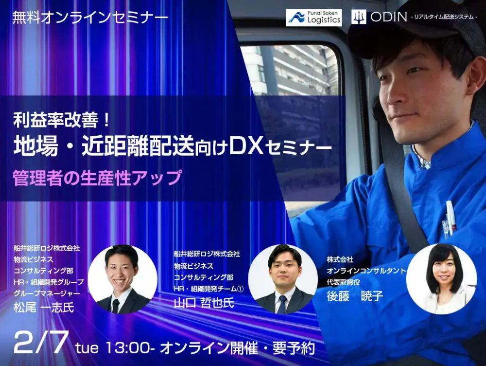 2/7(火)13:00よりオンラインで開催される、株式会社オンラインコンサルタント様主催「地場・近距離配送向けDXセミナー」で当社の物流コンサルタントが「地場・近距離配送が生産性を高めるポイント」と「生産性を劇的に改善する安全教育とは?」をテーマに講演いたします。 ぜひ、お気軽にご参加ください。