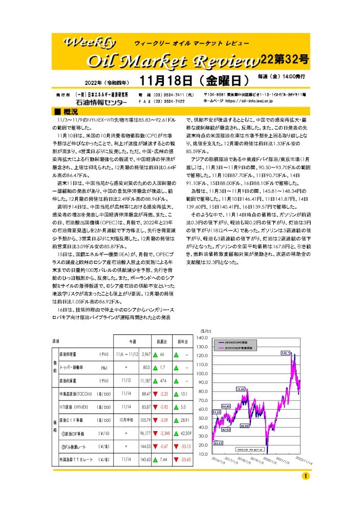 11/3~11/9のNYMEX・WTI先物市場は85.83~92.61ドルの範囲で推移した。11月10日は、米国の10月消費者物価指数(CPI)が市場予想ほど伸びなかったことで、利上げ速度が減速するとの観測が高まり、4営業日ぶりに反発した。