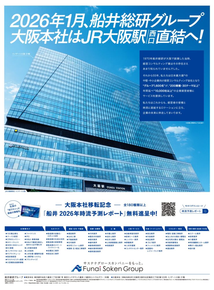 船井総研ロジ株式会社およびグループ各社は、大阪本社をJR大阪駅西口直結の「イノゲート大阪」へ移転し、2026年1月7日から営業開始いたします。