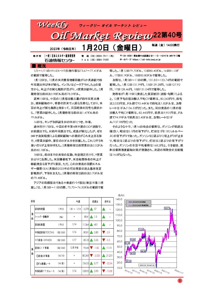 1/5~1/11のNYMEX・WTI先物市場は73.67~77.41ドルの範囲で推移した。1月12日は、12月の米消費者物価指数が6か月連続で前年同期比伸び率が鈍化、インフレはピークアウトしたとの見方から、利上げの鈍化観測が広がり、6営業日続伸した。2月限終値は前日比0.98ドル高の78.39ドル…