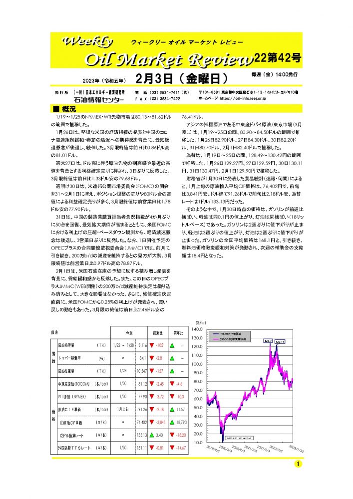 1/19~1/25のNYMEX・WTI先物市場は80.13~81.62ドルの範囲で推移した。1月26日は、堅調な米国の経済指標の発表と中国のコロナ関連規制緩和・春節の活況への期待感を背景に、景気後退懸念が後退し、続伸した。3月限終値は前日比0.86ドル高の81.01ドル…