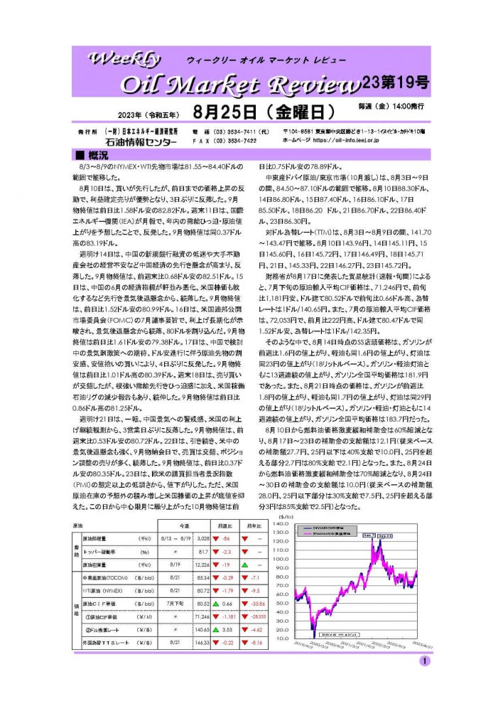 8月10日は、買いが先行したが、前日までの価格上昇の反動で、利益確定売りが優勢となり、3日ぶりに反落した。9月物終値は前日比1.58ドル安の82.82ドル。週末11日は、国際エネルギー機関(IEA)が月報で、年内の需給ひっ迫・原油値