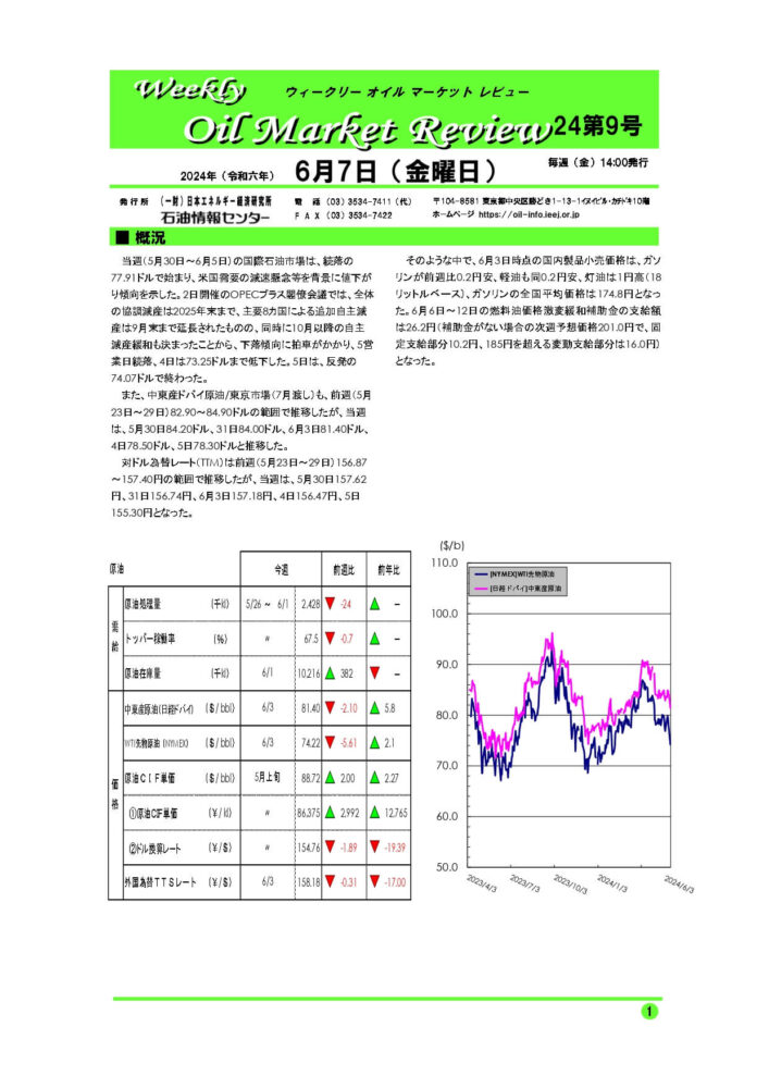 当週(5月30日~6月5日)の国際石油市場は、続落の77.91ドルで始まり、米国需要の減速懸念等を背景に値下がり傾向を示した。2日開催のOPECプラス閣僚会議では、全体の協調減産は2025年末まで、主要8カ国による追加自主減産は9月末まで延長されたものの、同時に10月以降の自主減産緩和も決まったことから、下落傾向に拍車がかかり、5営業日続落、4日は73.25ドルまで低下した。5日は、反発の74.07ドルで終わった。