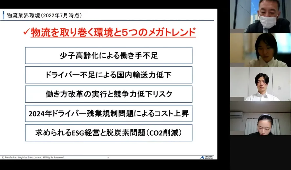 2022年10月13日(木)に2023年卒の内定者向けに「ソリューション・コンサルティングの事例紹介」と題して、内定者勉強会・座談会を開催いたしました。本イベントでは、内定者が船井総研ロジについての理解を深め、入社後によいスタートダッシュが切れるよう毎月開催されています。