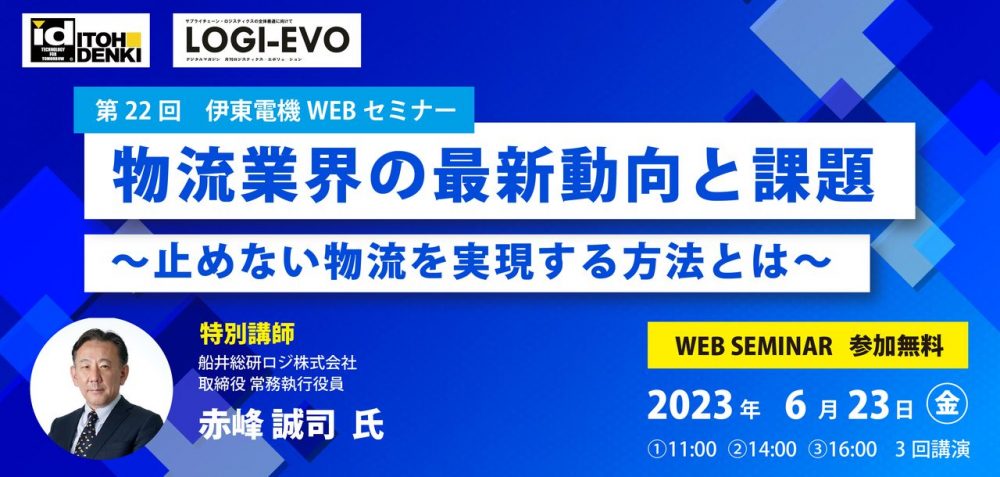 2023年6月23日(金)にオンラインで開催される「物流業界の最新動向と課題~止めない物流を実現する方法とは~(伊東電機株式会社様主催)」で、当社取締役 常務執行役員 赤峰が、グローバル環境からみた国内ロジスティクスの動向や2024年問題の先を見据えた今後の課題を講演いたします。 ぜひ、お気軽にご参加ください。