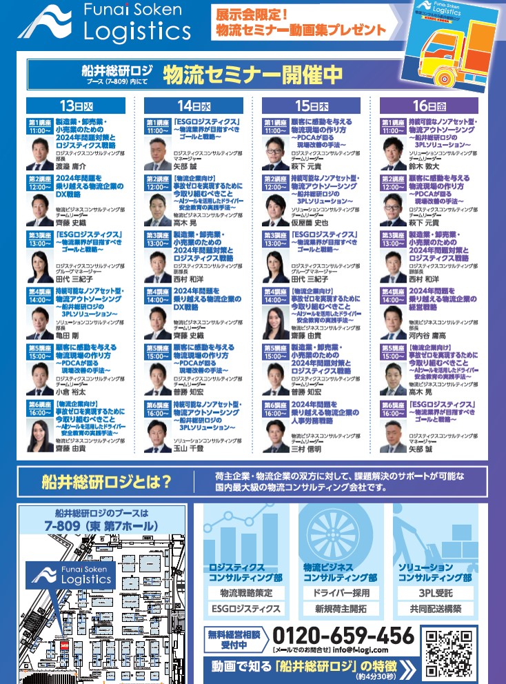 長時間労働・労働力不足・物量の変動・小口化への対応・トラックの積載効率の低下など、多様化する課題に対応するには、自社物流における現状把握が不可欠です。また、自社物流の現状把握なくして精緻な分析や設計、綿密な計画を策定することは不可能です。 物流戦略策定から物流拠点の最適配置、3PLによるコスト削減・ルート輸送最適化など、一口に『物流』といっても、その中には多くの改善項目があります。当社は日々顕在化していく物流課題に加え、様々な業種・業態の物流を調査・分析・改善するサービスを提供しています。 主な出展サービス ■ 2024年問題対策(荷主企業向け・物流企業向け) ■ ESGロジスティクスの導入 ■ コスト削減(輸配送・倉庫作業) ■ トラック事故ゼロ など 船井総研ロジ ブース内セミナースケジュールを見る≫
