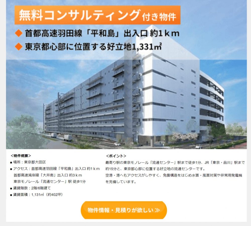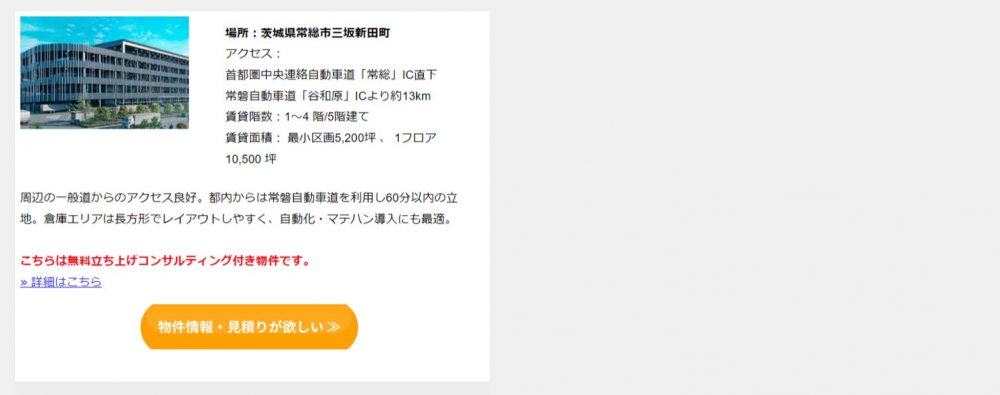 物流不動産マッチングでは、「物流倉庫の立ち上げ無料コンサルティング付き物件」を提供しています。仲介業だけではなく、強固な物流体制の構築を実現する、船井総研ロジならではのサービスとなります。