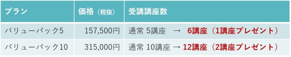 期間中に当ページよりお申込の方へ、「バリューパック5」は1講座、「バリューパック10」は2講座のプレゼントを行っています。