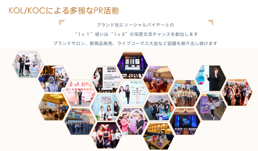 日本バイヤー連盟は日本ブランドの中国市場進出を使命に、ソーシャルバイヤーの力をフル活用し、ブランディングから商品プロモーションまでワンストップサービスを提供しています。ブランドとソーシャルバイヤー間のマッチングを目的にした展示会をこれまで日本、中国の主要都市で11回成功に開催し、3万人以上のバイヤーが来場。商品プロモーション提案の一環としてライブコマースを実施し、2019年のライブ大会ではGMV「総流通額」は14億円相当の売上記録を創出しました。美容、健康、ファッション、ジュエリーおよび日用品関係のブランドを手掛け、1000社以上の取引実績を持っています。