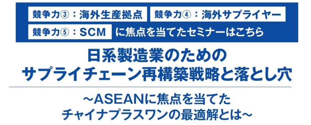 当セミナーでは、ASEANサプライチェーン再構築のオプションを紹介し、自社がとるべき最適解を見つけるため、チャイナプラスワンのサプライチェーン再構築の成功事例を解説します。