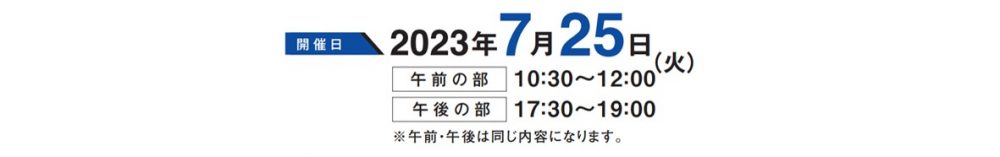 | 開催日時 | 2023年7月25日(火)10:30~12:00 2023年7月25日(火)17:30~19:00 ※ 午前・午後は同じ内容になります |