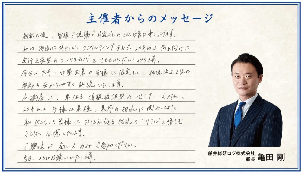| 対象 | 当セミナーは 荷主企業の経営者、経営幹部の方に限定させていただきます。 対象業種以外でご興味のある方は、順次同様のセミナーを企画しますのでお待ちください。 |