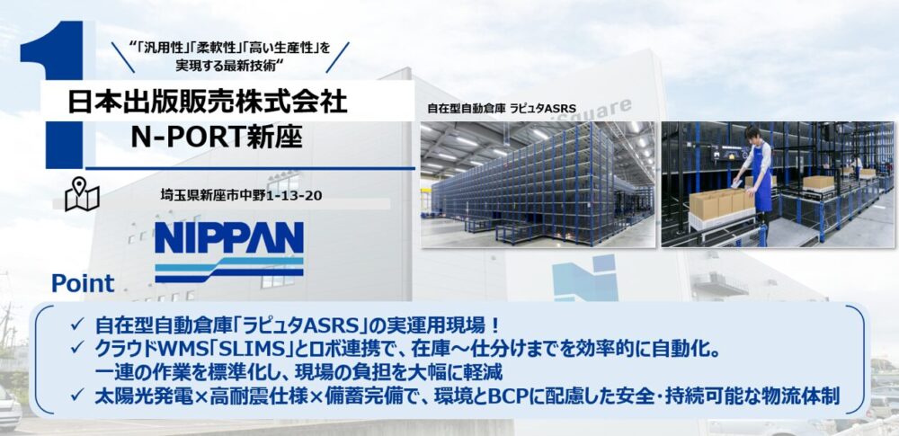 ・自在型自動倉庫「ラピュタASRS」の実運用現場! ・クラウドWMS「SLIMS」とロボ連携で、在庫〜仕分けまでを効率的に自動化一連の作業を標準化し、現場の負担を大幅に軽減 ・太陽光発電×高耐震仕様×備蓄完備で、環境とBCPに配慮した安全・持続可能な物流体制