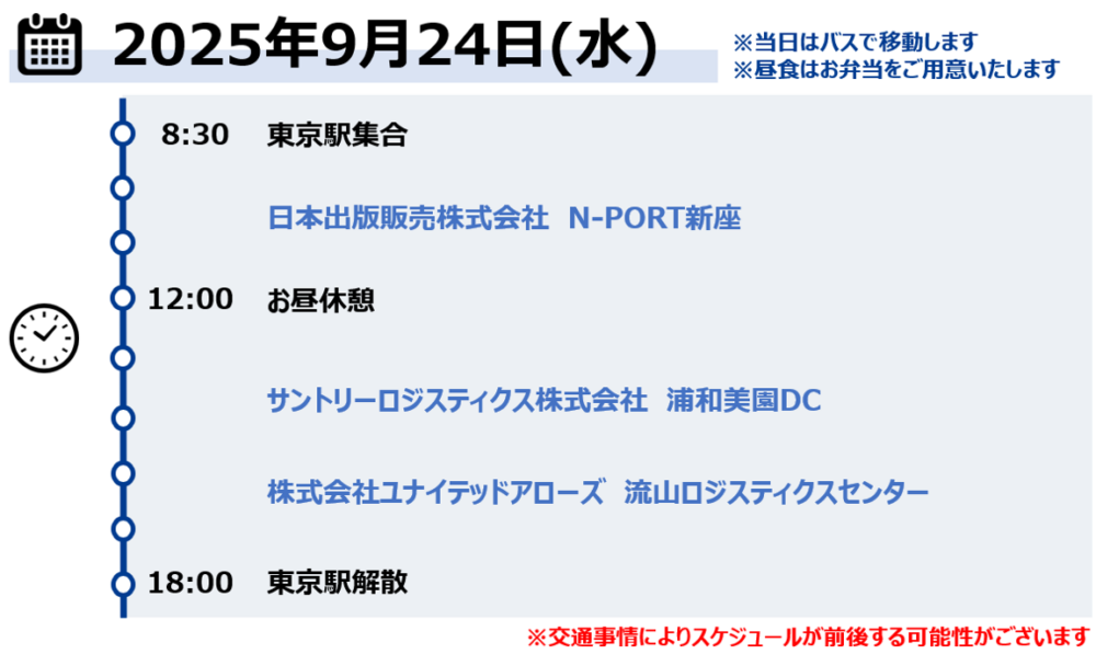 | 実施概要 | 旅行企画・実施:株式会社船井総合研究所 イベント企画・実施:船井総研ロジ株式会社 共催:株式会社アパレルウェブ ※本視察は、船井総合研究所を主催旅行会社とする募集型企画旅行です。詳細は船井総合研究所のツアーLPをご確認ください。 ≫https://www.funaisoken.co.jp/seminar/131849 |