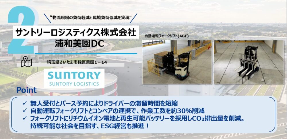 ・無人受付とバース予約によりドライバーの滞留時間を短縮 ・自動運転フォークリフトとコンベアの連携で、作業工数を約30%削減 ・フォークリフトにリチウムイオン電池と再生可能バッテリーを採用しCO₂排出量を削減。持続可能な社会を目指す、ESG経営も推進!